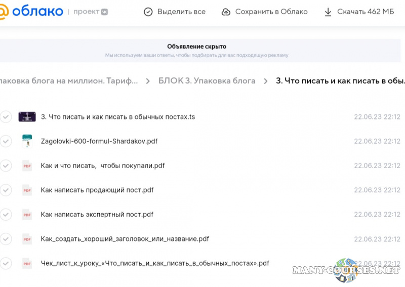 Вы находитесь на странице товара «Галина Мельникова - Упаковка блога на миллион. Тариф Я все могу», это материал 2023 года, который, мы надеемся, принесет вам пользу. Данный курс расположен на платформе «Облако Mail».Скриншоты с платформы на которой расположены материалы вы можете найти выше. В нашем магазине курсы доступны по самым выгодным ценам. Вы можете перейти на оригинальный продажник, после чего принять решение о покупке. Если бы вы покупали у самого автора, то данный курс вам обошелся 50000 рублей. Вы получаете этот курс, купив в нашем магазине MANY-COURSES.NET, с огромной скидкой, всего 550 рублей. Обучающий курс входит в рубрику «SEO и SMM / Бизнес, менеджмент, продажи», вы можете поискать другие сливы курсов в этой рубрике. В нашем магазине Вы найдёте ещё много курсов от автора «Галина Мельникова», достаточно ввести в поиск имя автора.